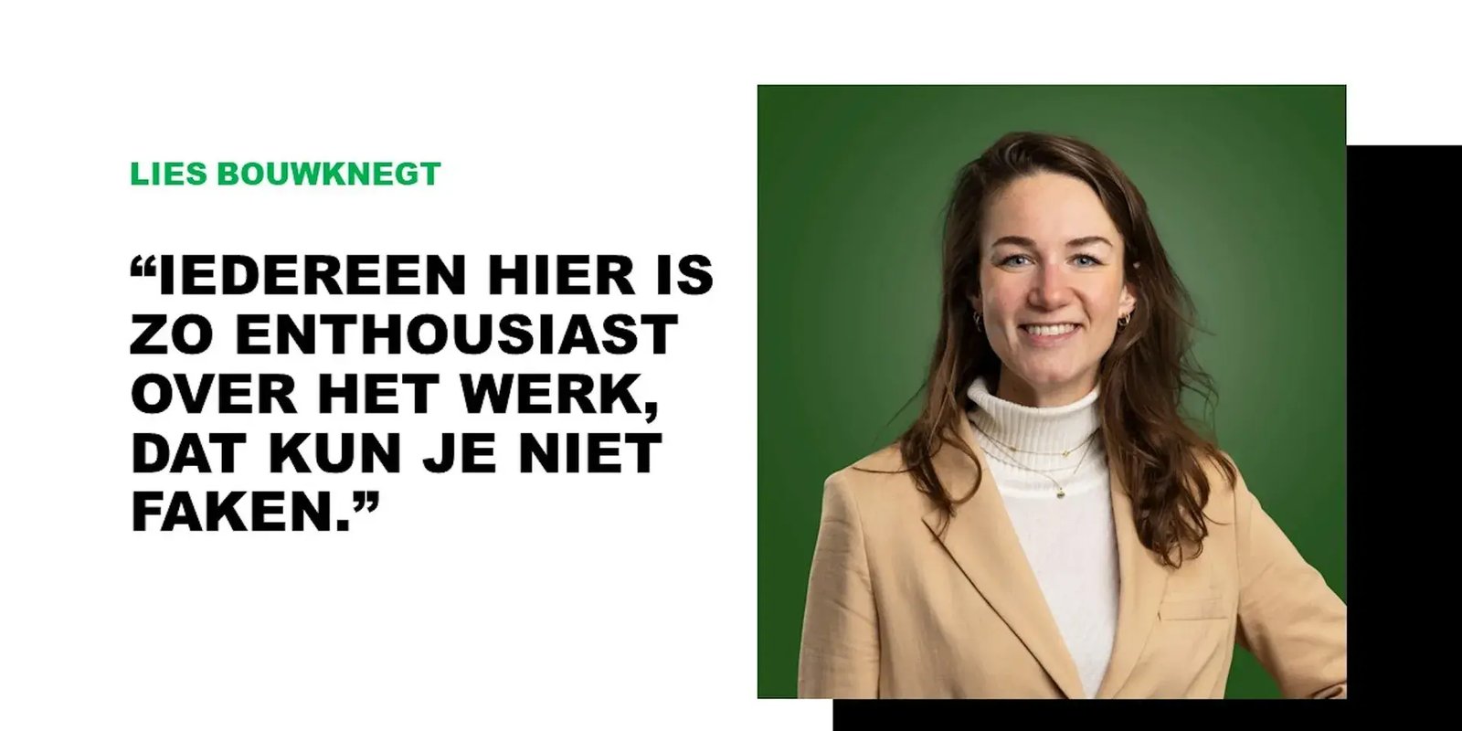 “Het was mijn doel een organisatie te vinden waar ik voor de langere termijn kan landen. En die heb ik gevonden! Alles wijst erop dat ik hier nog wel een poos blijf. Ik kan nog veel leren en alle kanten op groeien. Ik heb het zo naar mijn zin dat ik zelfs al zes mogelijke kandidaten in mijn omgeving enthousiast heb gemaakt met mijn verhalen. Dus Iris mag aan het werk, haha.”
